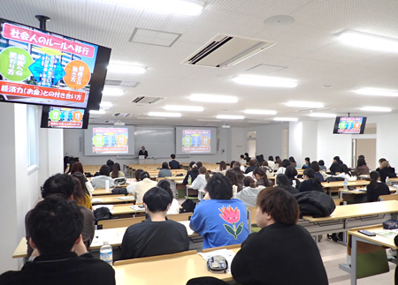 昨年度に引き続きオフィス fukure 松井氏を講師にお迎えして、学部全学科の4年生を対象にキャリア形成講座を開催しました。講座では、労働法、お金の管理の仕方、保険、楽しく仕事ができるために大切にして欲しい事などについて、ご説明をいただきました。