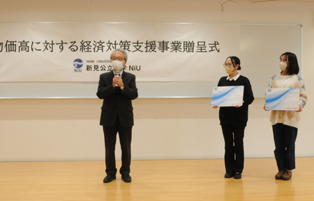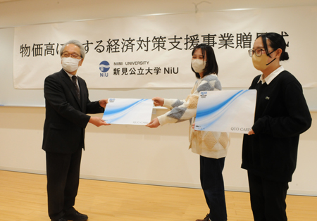 令和4年12月19日に、地域共生推進センター棟1階コミュニティカフェで開催しました贈呈式では、公文学長から学生代表2人に「QUOカードの目録」を贈呈しました。