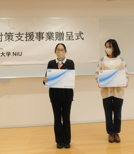 公文裕巳学長より、クオカードの目録が学生代表に送られました。