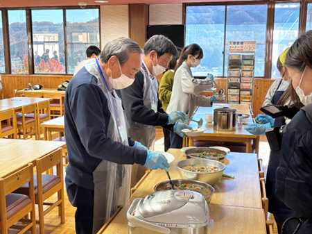 「森林どり」を使った鶏の治部煮、さつまいもご飯、みそ汁、での会食