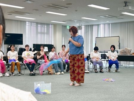 楽器やスカーフを使った音楽療育の実践法をみんなで体験しました。