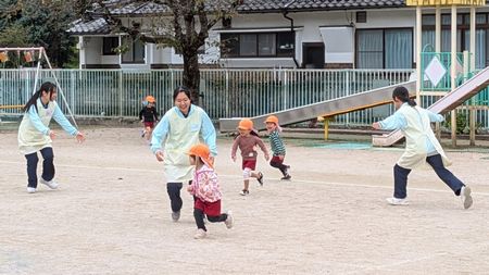 鬼ごっこの様子。元気いっぱいの子どもたちに負けじと追いかけます。