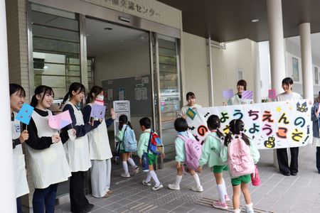 今回、みのり幼稚園の歓迎ボランティアに参加しました。にーみん体操を踊ったり、歓迎の旗を用意したりと倉敷からやってくる子どもたちが素敵な時間が過ごせるように努めました。そのおかげで当日は子どもたちとすぐに距離を縮め、笑顔を見ることができ,参加してよかったと感じました。また、先生方の子どもへの関わりを間近で見たり、自分も子どもたちと触れ合ったりする中で、将来の自分の姿を重ねることができ、とても貴重な経験になりました。(4年:古賀美咲)