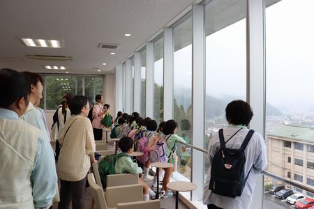 地域交流センター棟5階の展望室を見学しました。雨模様でしたが、新見の町が見えました。