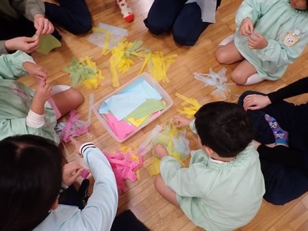 保育2年生Bグループの造形表現活動交流です。お花紙をちぎります。