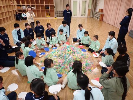 造形の授業でいろいろ知識を学んでいますが、実際に子ども達と一緒にやってみることでいろいろな気付きを得ました。学生だけでちぎったお花紙を団扇であおいで遊んだ時にはスムーズにできたけれども、子ども達は仰ぐだけではなく、お花紙の中に入って楽しんでいました。予想外でしたが、お花紙だけでもこんなに楽しんでくれるのだとわかり、嬉しかったです。(2年造形Bグループリーダー:日浅湖都・渡部愛)
