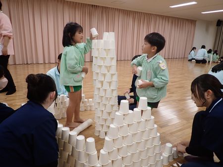 保育2年生Aグループの造形表現活動交流です。紙コップを使って遊びました。