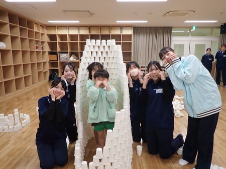 今回の造形活動を通して、子どもたちの自由な発想や創造力の豊かさを実感しました。紙コップを使った活動では、友だちや大学生と協力して大きな作品を作り上げる姿や、壊すときに見せる生き生きとした表情が印象的でした。今後の保育でも、一人ひとりの「やってみたい」という気持ちを大切にしていきたいです。(2年造形Aグループリーダー:鹿野栞莉・川口めぐみ)