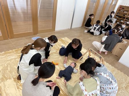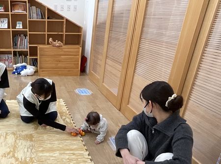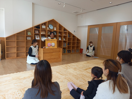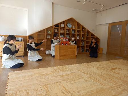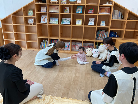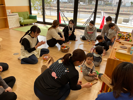 大学内にある子育てカレッジ親子交流広場「にこたん」のプログラム型活動として、今年度最後の「ほっこりタイム」を駅西サテライトで実施し、保育学科4年生5名が企画参加しました。0~2歳児のお子さんと保護者が8組参加され、「お弁当をつくって公園に遊びに行こう!」というテーマでペープサートや親子ふれあい遊び、絵本やダンスを一緒に楽しみました。フリータイムの時間は、おもちゃを使って一緒に遊んだり、保護者の方とお話をしたりしました。