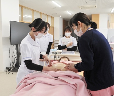 妊婦体験や赤ちゃん人形を使った演習では、学生同士で取り組み、命の誕生に寄り添う看護の大切さを実感します。